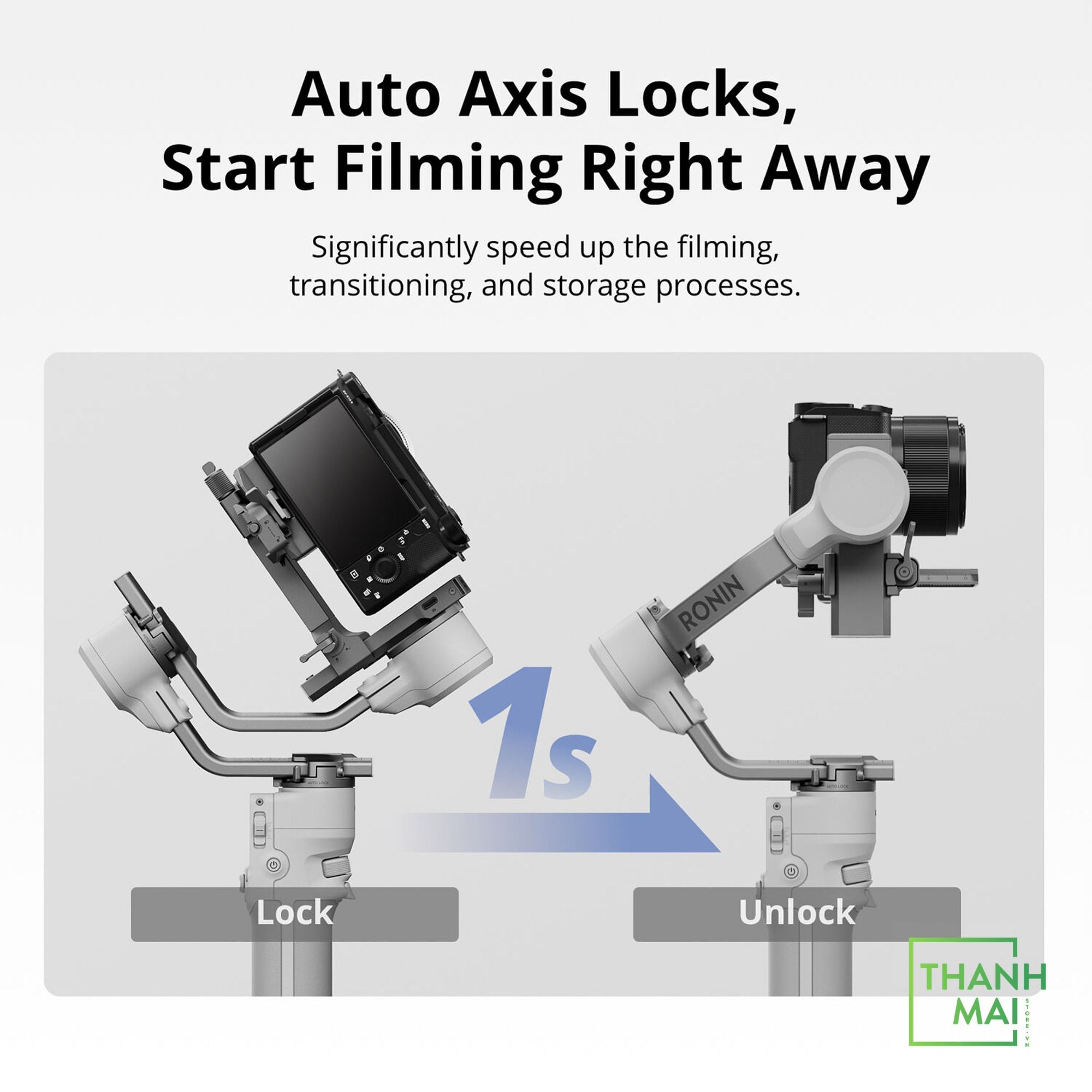 Khóa trục tự động là tính năng thường có trong các dòng gimbal cao cấp tiền nhiệm nay đã có mặt trên DJI RS4 Mini. Nhờ đó, gimbal có thể khóa 3 trục tự động, mở khóa khi bật nguồn và khóa khi tắt nguồn hoặc ngủ chỉ trong 1 giây. Điều này giúp người dùng tiết kiệm đáng kể thời gian và nâng cao hiệu suất làm việc, nhất là trong những tình huống cần di chuyển liên tục.
