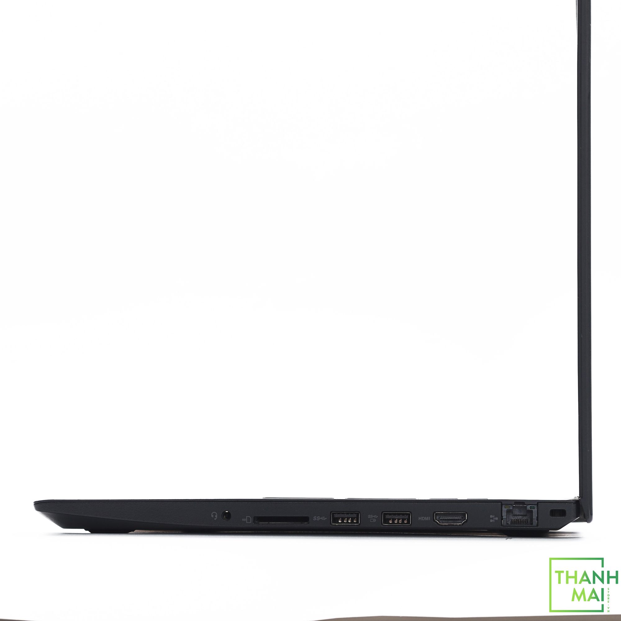 Cạnh phải: giác Tai Nghe/ micrô, đầu đọc thẻ SD, 2 cổng USB loại A. HDMI-out, RJ45 Ethernet.