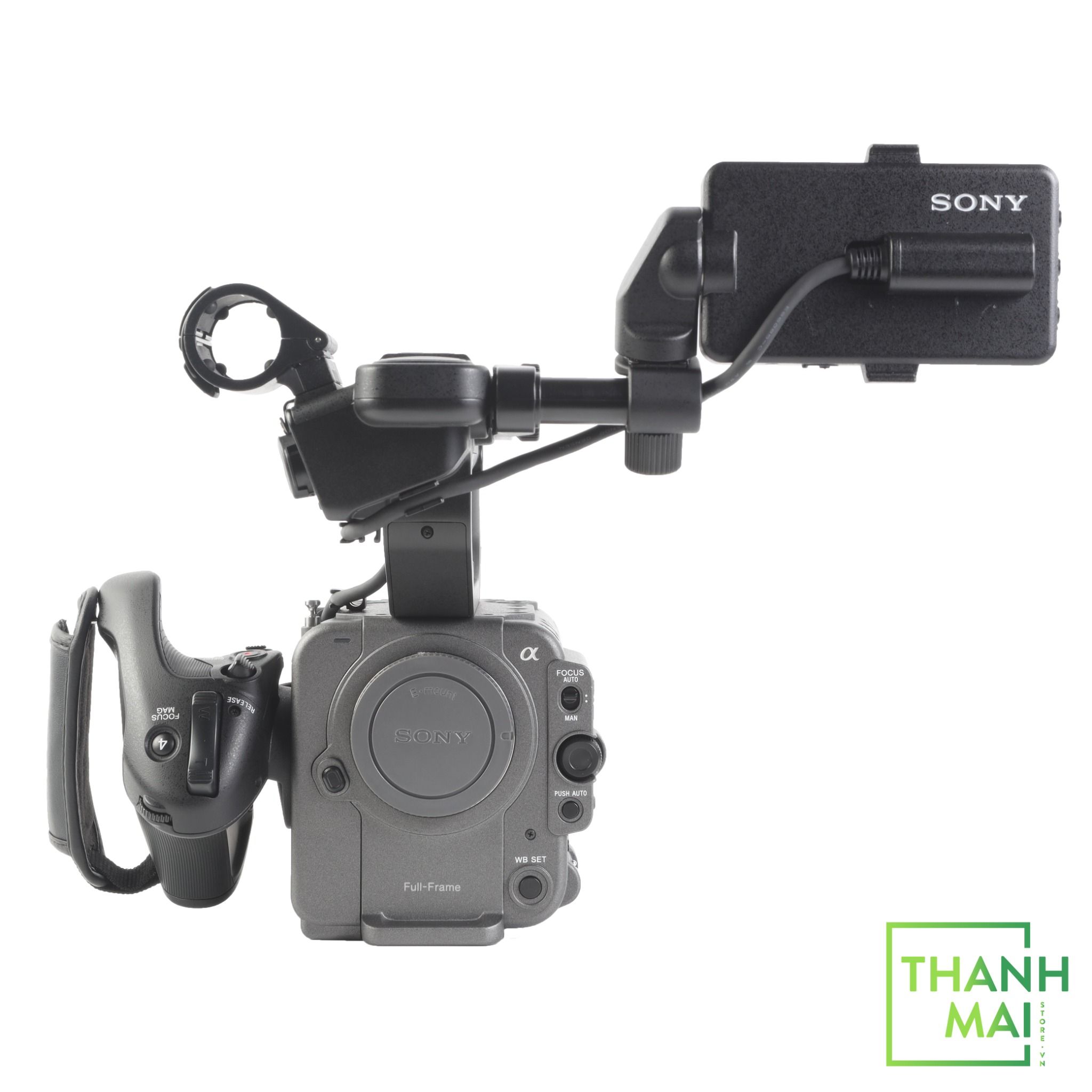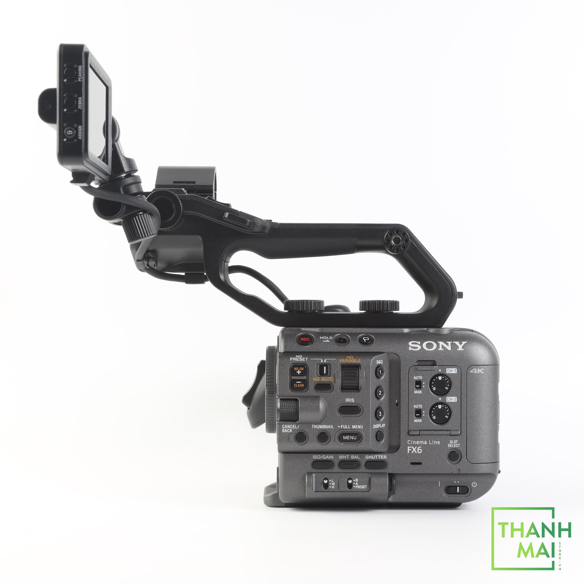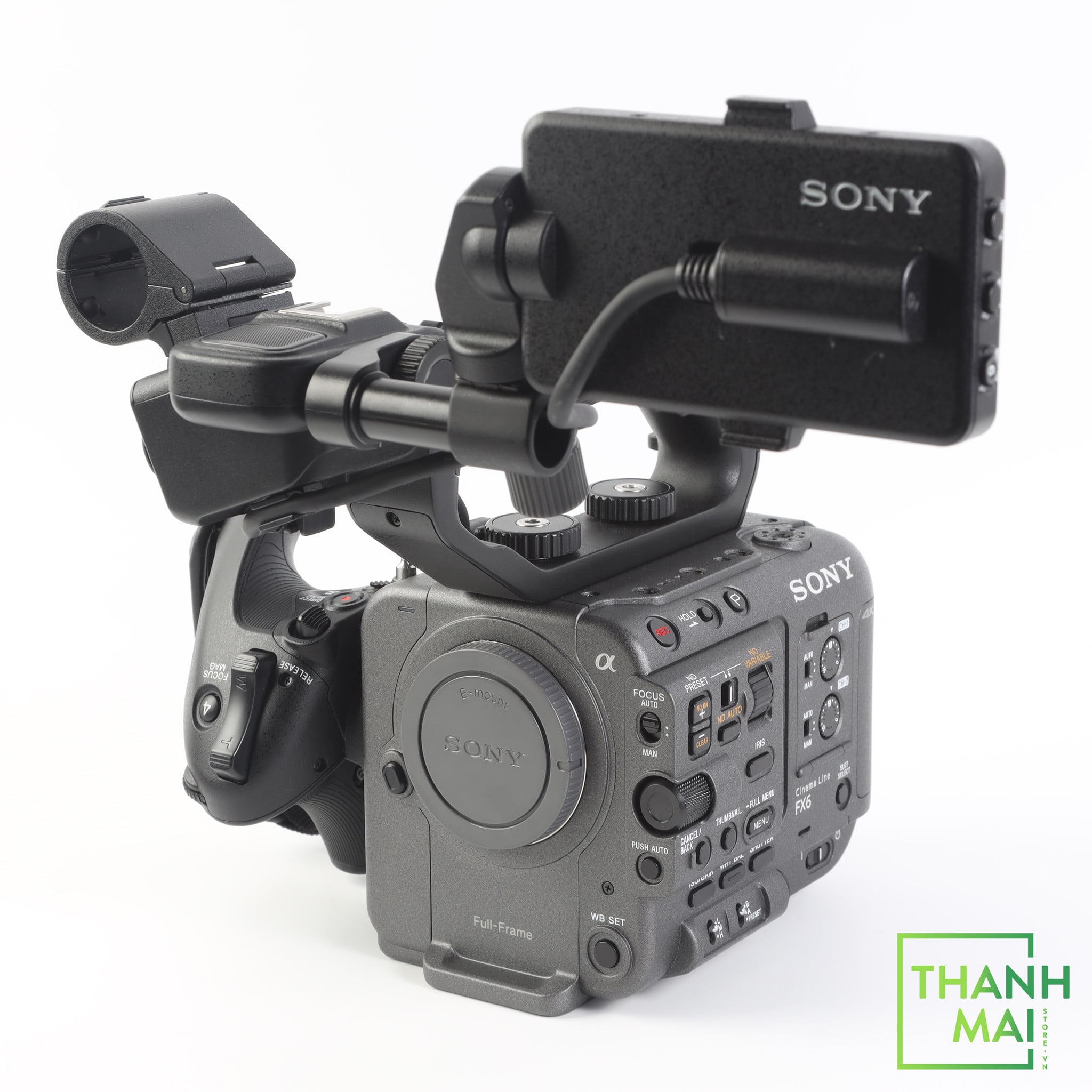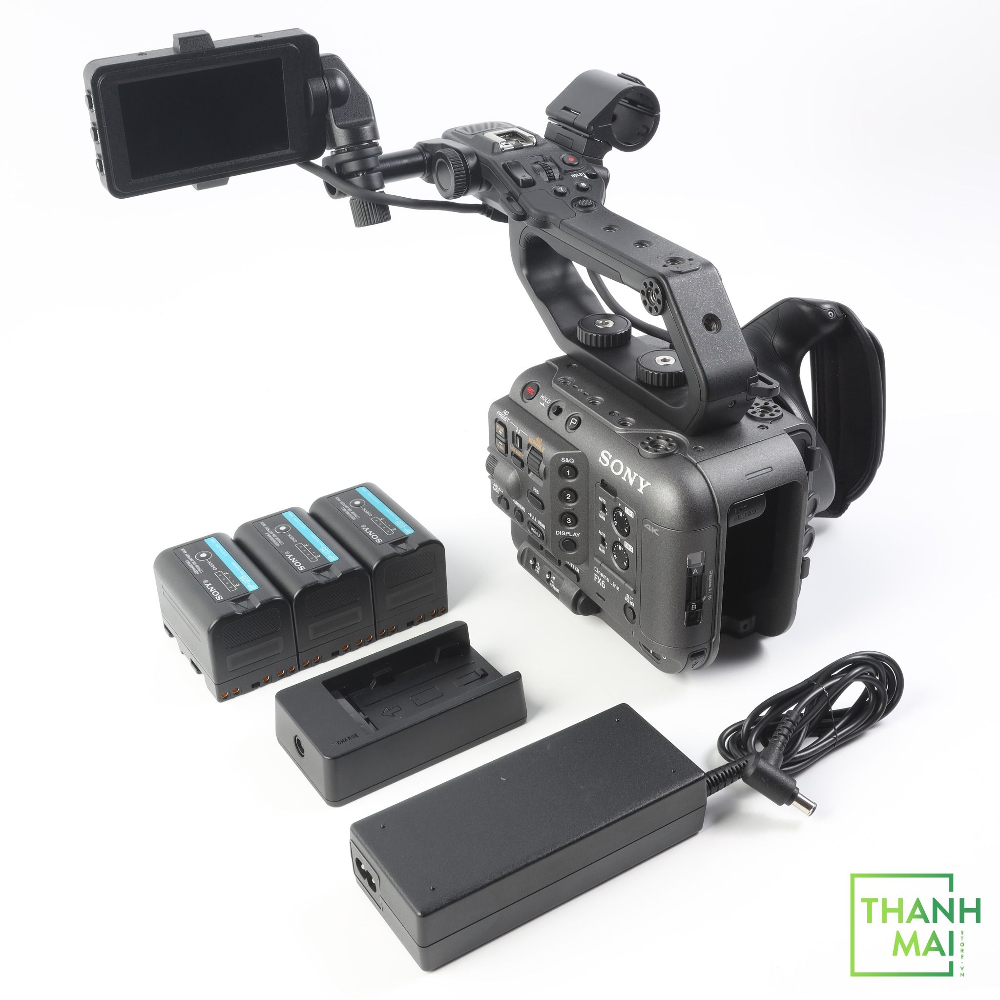 Phụ kiện đi kèm: Body FX6, Handle Unit, 3.5" LCD Monitor, Grip Remote Control, 3 Pin Sony BP-U35, AC Adapter, BC-CU1 Battery Cradle, Power Cord, Lens Mount Cap.